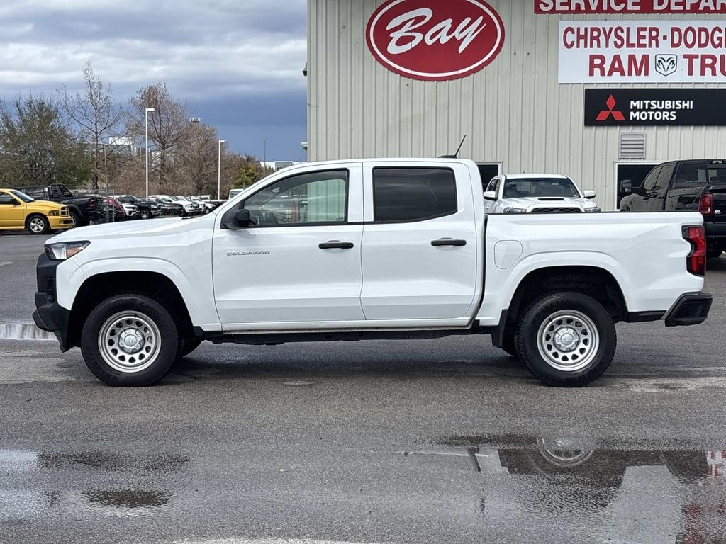 Chevy Safety Assist, Front Bucket Seats, Preferred Equipment Group 2WT, 3.42 Rear Axle Ratio, 4-Way Manual Passenger Seat Adjuster, 4-Wheel Disc Brakes, 6 Speakers, 6-Speaker Audio System Feature, 6-Way Manual Driver Seat Adjuster, ABS brakes, Air Conditioning, All-Weather Floor Mats, AM/FM radio: SiriusXM, Apple CarPlay/Android Auto, Auto High-beam Headlights, Automatic Emergency Braking, Brake assist, Cloth Seat Trim, Delay-off headlights, Driver door bin, Driver vanity mirror, Dual front impact airbags, Dual front side impact airbags, Electronic Stability Control, Following Distance Indicator, Forward Collision Alert, Front anti-roll bar, Front Center Armrest, Front Pedestrian & Bicyclist Braking, Front wheel independent suspension, IntelliBeam Automatic High Beam On/Off, Lane Keep Assist w/Lane Departure Warning, Low tire pressure warning, Navigation System, Occupant sensing airbag, Overhead airbag, Panic alarm, Passenger door bin, Passenger vanity mirror, Power door mirrors, Power steering, Power windows, Radio data system, Radio: 11.3" Diagonal Advanced Color LCD Display, Rear step bumper, Remote keyless entry, Security system, SiriusXM Radio, Speed-sensing steering, Split folding rear seat, Steering Wheel Mounted Audio Controls, Steering wheel mounted audio controls, Tachometer, Tilt steering wheel, Traction control, Trip computer, Variably intermittent wipers, Wheels: 17" x 8" Ultra Silver Metallic Steel, Wireless Phone Projection, Chevy Safety Assist, Front Bucket Seats, Preferred Equipment Group 2WT. Summit White 2024 Chevrolet Colorado Work Truck RWD 8-Speed Automatic 2.7L Turbo