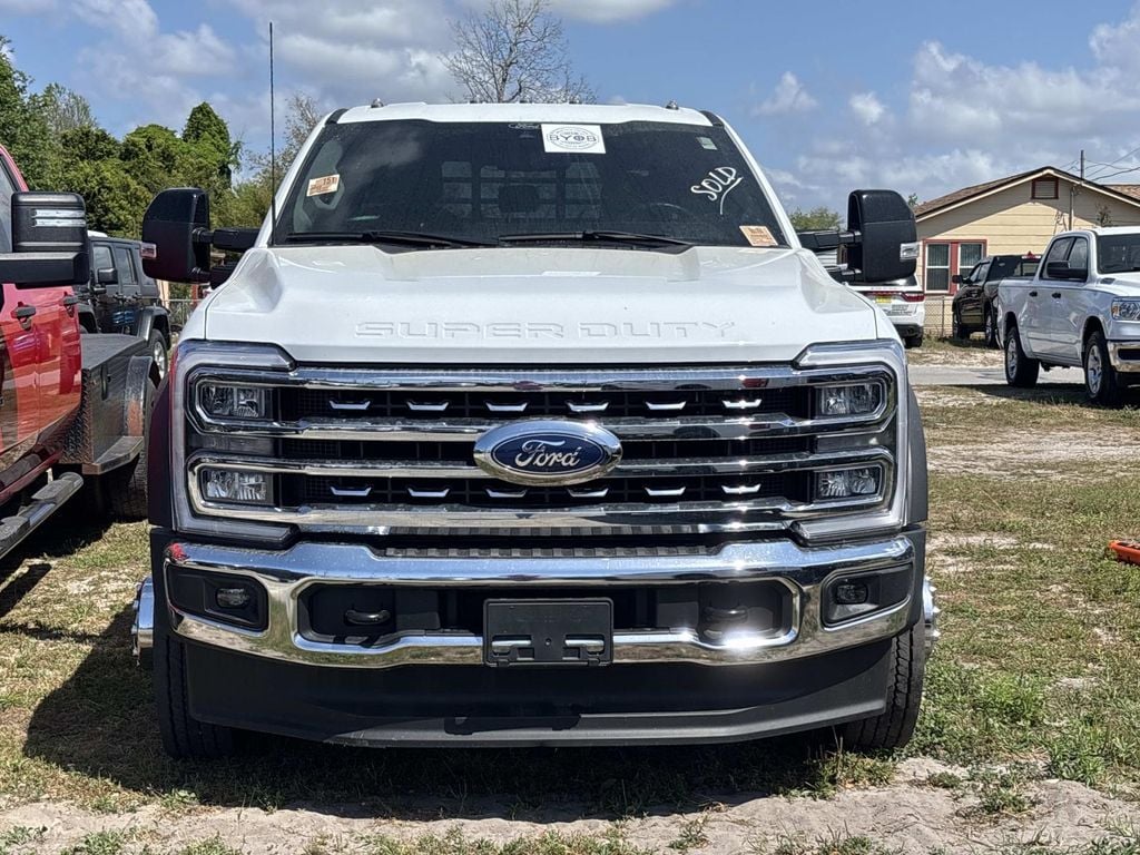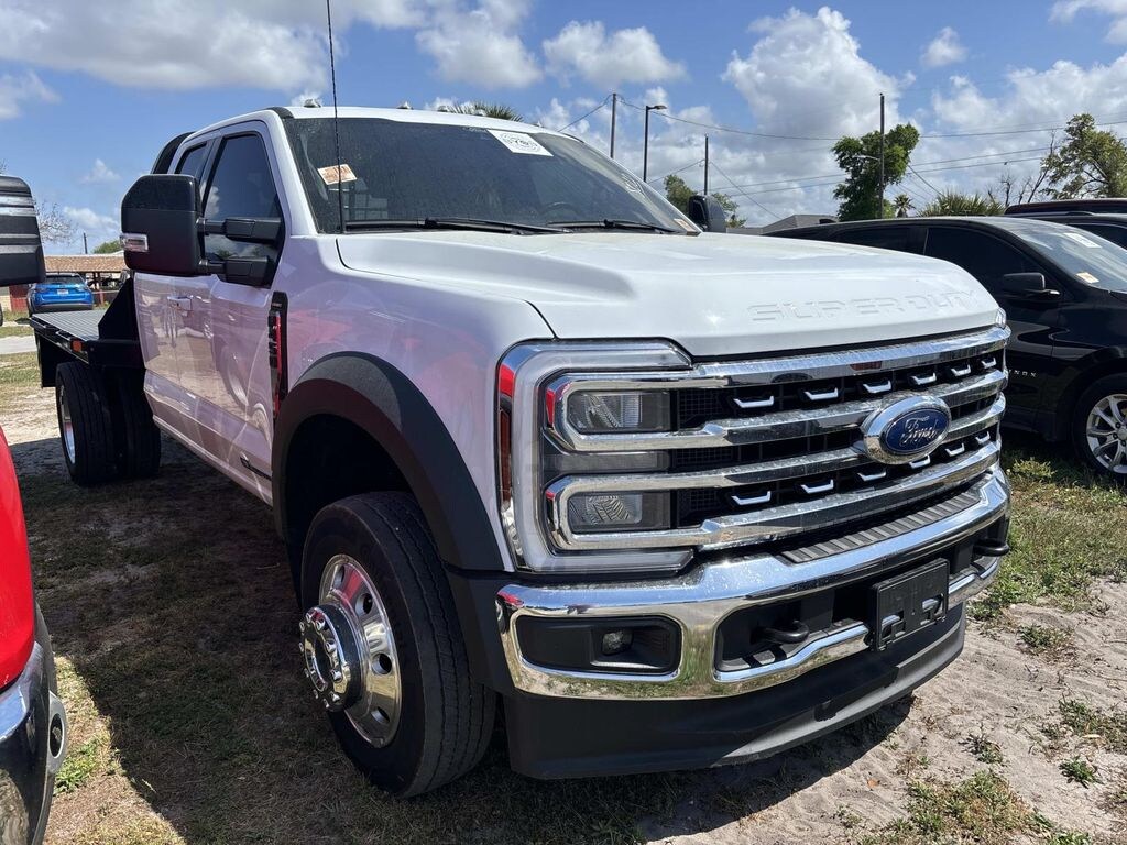 4WD, 4-Wheel Disc Brakes, 8 Speakers, ABS brakes, Adjustable pedals, Air Conditioning, Alloy wheels, AM/FM radio: SiriusXM with 360L, Auto tilt-away steering wheel, Auto-dimming Rear-View mirror, Automatic temperature control, Brake assist, Bumpers: chrome, Compass, Delay-off headlights, Driver door bin, Driver vanity mirror, Dual front impact airbags, Dual front side impact airbags, Dual rear wheels, Emergency communication system: SYNC 4 911 Assist, Front anti-roll bar, Front Bucket Seats, Front Center Armrest, Front dual zone A/C, Front fog lights, Front Leather Seating Surfaces 40/Console/40, Front License Plate Bracket, Front reading lights, Fully automatic headlights, Garage door transmitter, GVWR: 16,500 lb Payload Package, Heated door mirrors, Heated front seats, Illuminated entry, Leather steering wheel, Memory seat, Navigation system: Connected Navigation (includes complimentary 1-year trial), Order Code 658A, Outside temperature display, Overhead airbag, Overhead console, Panic alarm, Passenger cancellable airbag, Passenger door bin, Passenger vanity mirror, Pedal memory, Power door mirrors, Power driver seat, Power passenger seat, Power steering, Power windows, Pro Power Onboard - 2kW, Radio: B&O Sound System by Bang & Olufsen, Rear anti-roll bar, Rear window defroster, Remote keyless entry, Security system, SiriusXM w/360L, Speed control, Split folding rear seat, Steering wheel memory, Steering wheel mounted audio controls, SYNC 4 w/Enhanced Voice Recognition, Tachometer, Telescoping steering wheel, Tilt steering wheel, Traction control, Trip computer, Turn signal indicator mirrors, Variably intermittent wipers, Ventilated front seats, Wheels: 19.5" x 6" Forged Polished Aluminum, 4WD. Oxford White 2024 Ford F-450SD Lariat DRW 4WD 10-Speed Automatic Power Stroke 6.7L V8 DI 32V OHV Turbodiesel